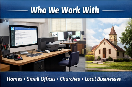 Our customers include home users, remote workers, small offices, churches, and local businesses that need dependable technology support without enterprise-level complexity.